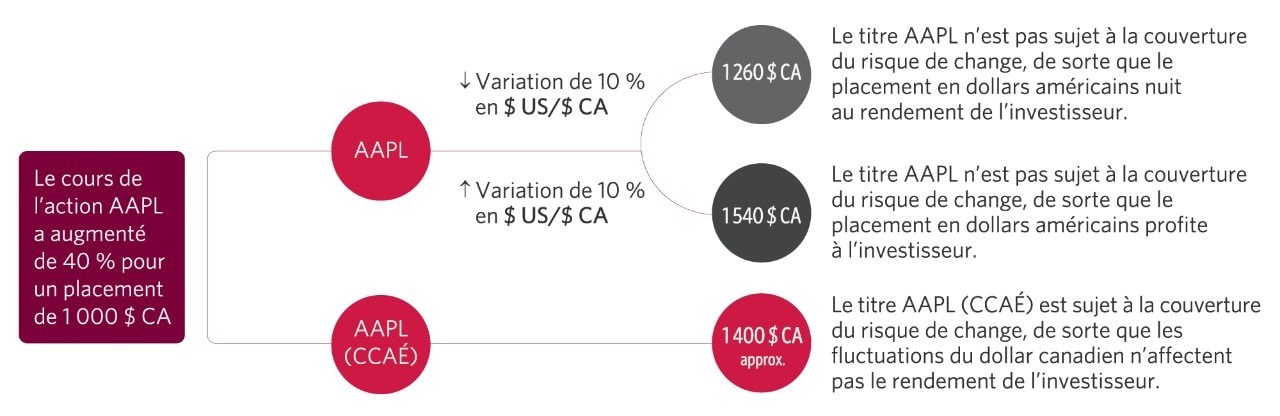 | Le dollar canadien se déprécie par rapport au dollar américain | Cours de clôture négatif | Ratio du CCAÉ en baisse Conséquence : chaque CCAÉ représente un nombre plus faible d’actions sous-jacentes. |